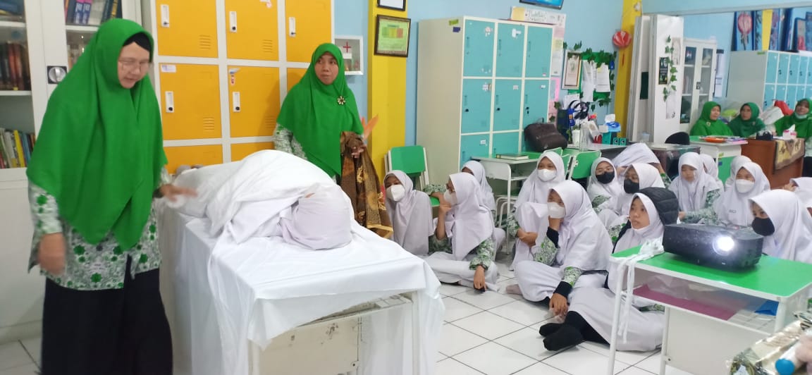 Tangerang Selatan, (9/3) Acara Dauroh Janaiz (Pelatihan Penyelenggaraan Jenazah) yang ditaja oleh Bina Pribadi Islam pada hari Kamis, 9 maret 2023 berjalan dengan lancar. Dauroh yang diadakan di Masjid Ulul Albab khusus untuk siswa putra dan Ruang kelas 8B khusus untuk siswi putri ini disambut antusias oleh peserta yang merupakan peserta dari masing-masing kelompok BPI.