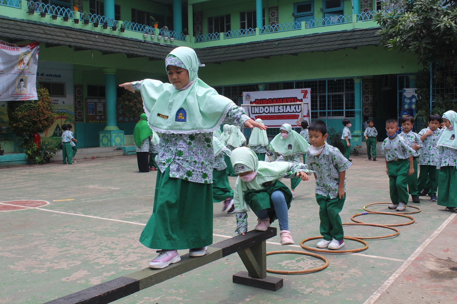 Kegiatan Outdoor SDIP Baitul Maal : bermain enggrang batok, bermain lompat tali, melompati holalop dan berjalan diatas papan titian.
