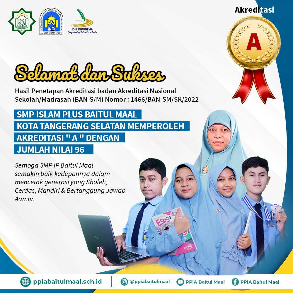Hasil penetapan Akreditasi yang telah dilakukan oleh Badan Akreditasi Nasional Sekolah/Madrasah (BAN-S/M) Nomor 1466/BAN-SM/SK/2022 menetapkan SMP Islam Plus Baitul Maal Kota Tangerang Selatan memperoleh Akreditasi “ A” dengan jumlah Nilai “ 96 “